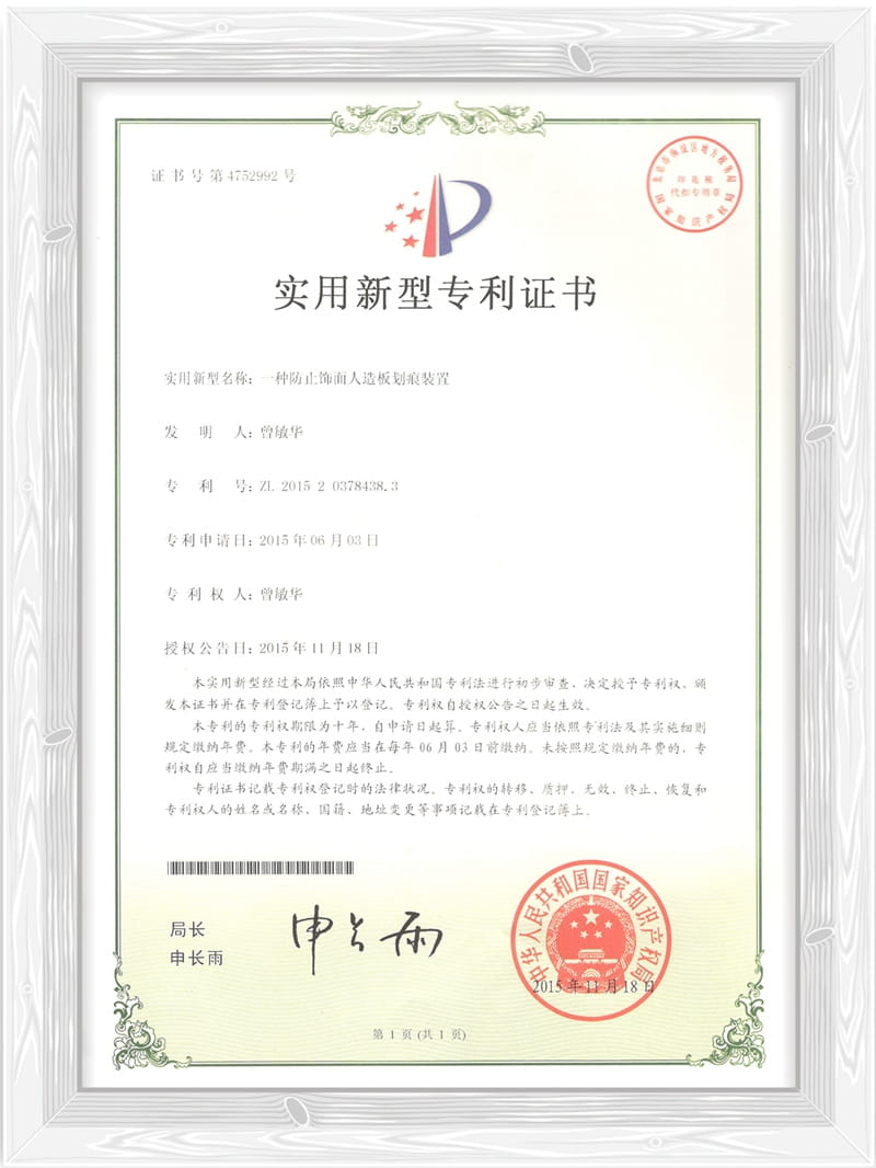 一种防止饰面人造板划痕装置专利证书