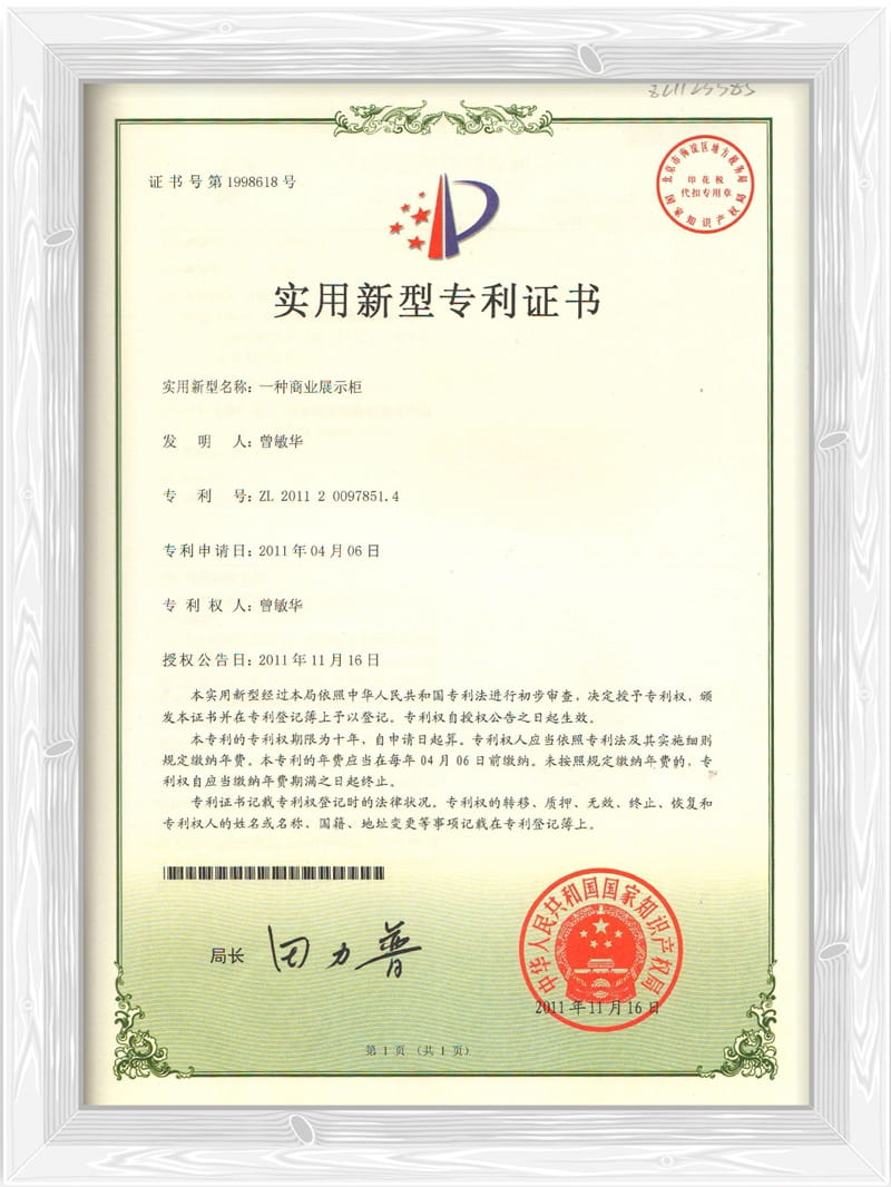 一种商业展示柜专利证书