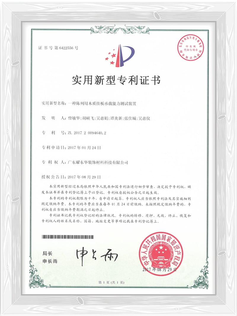 一种陈列用木质挂板承载能力测试装置专利证书