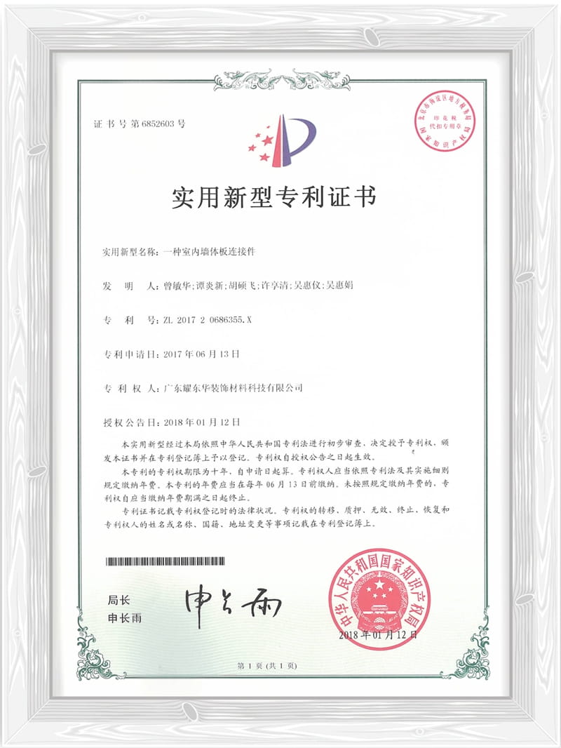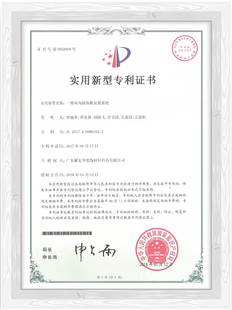 一种室内墙体板安装系统专利证书