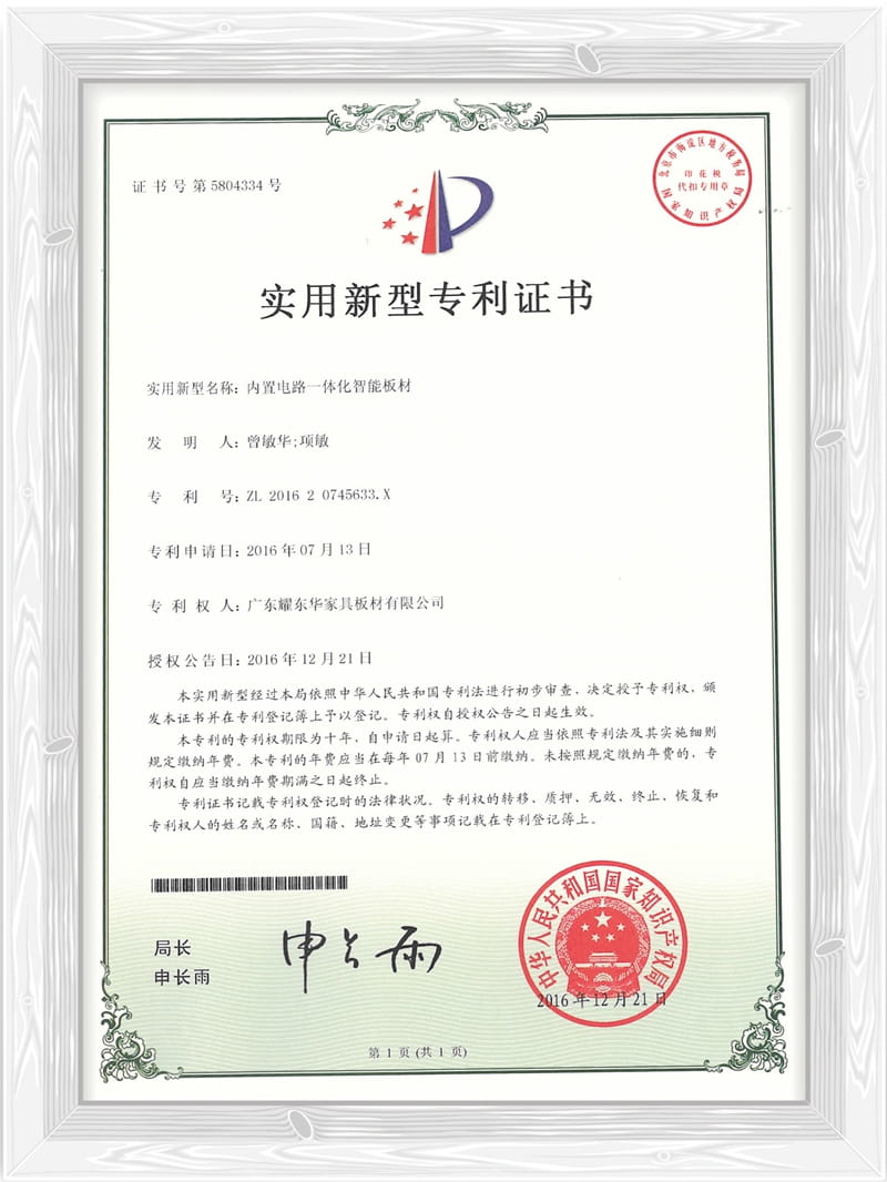 内置电路一体化智能板材专利证书