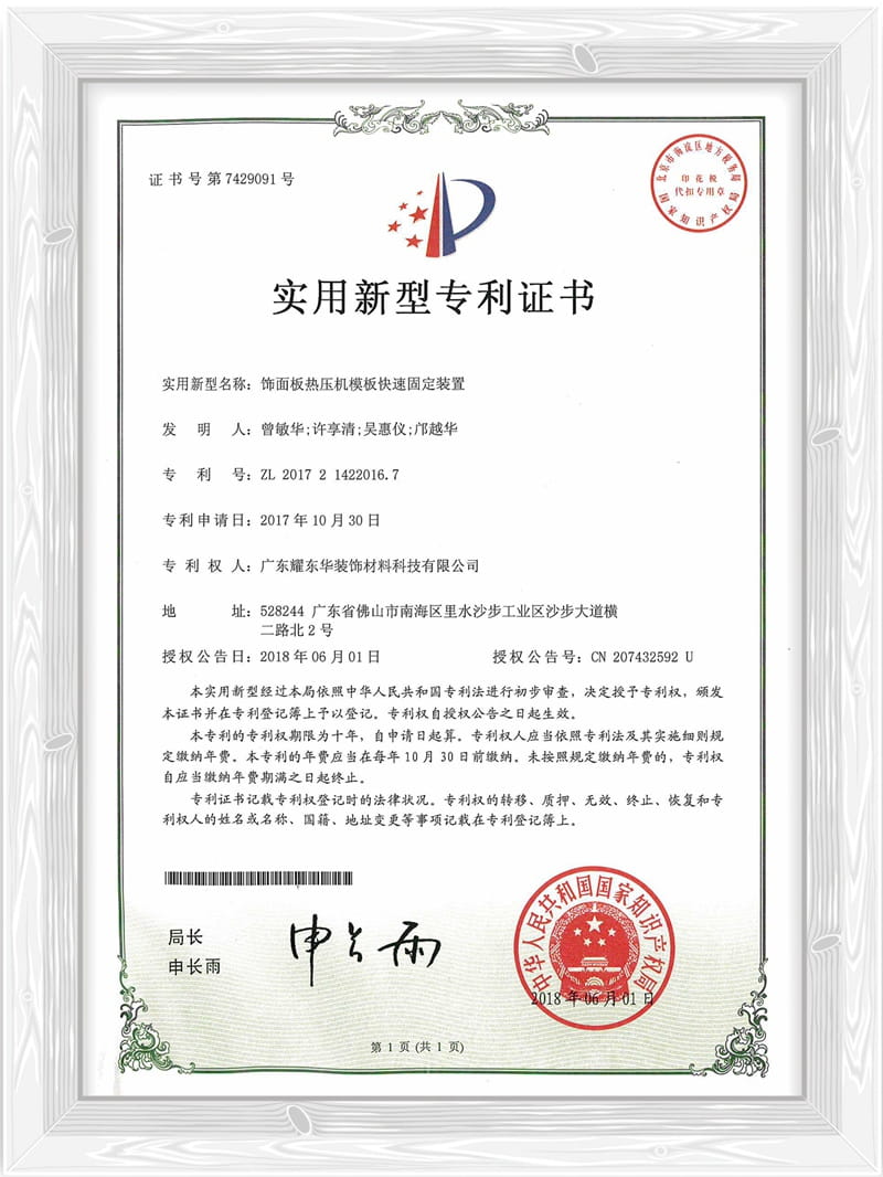 饰面板热压机模板快速固定装置专利证书