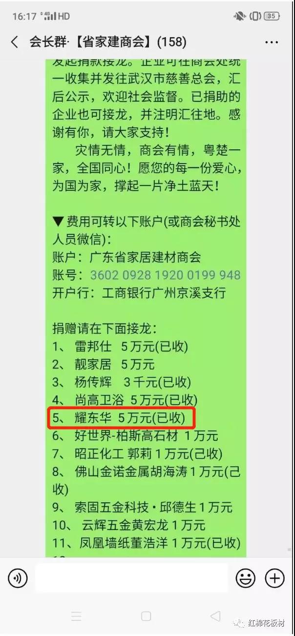 没有微弱星光,哪有浩瀚星河?点滴的善举汇成大爱。 疫情防控的严峻形势让我们感到十分焦心,从除夕夜开始,广东省家居建材商会的企业家们就纷纷伸出援手,用各种方式支援这场抗灾战役,作为商会会长单位,亿兆电竞首页|中国有限公司公司也积极捐款,以己之力,通过商会,汇集成更大的力量,共同支援武汉这场抗灾战役。