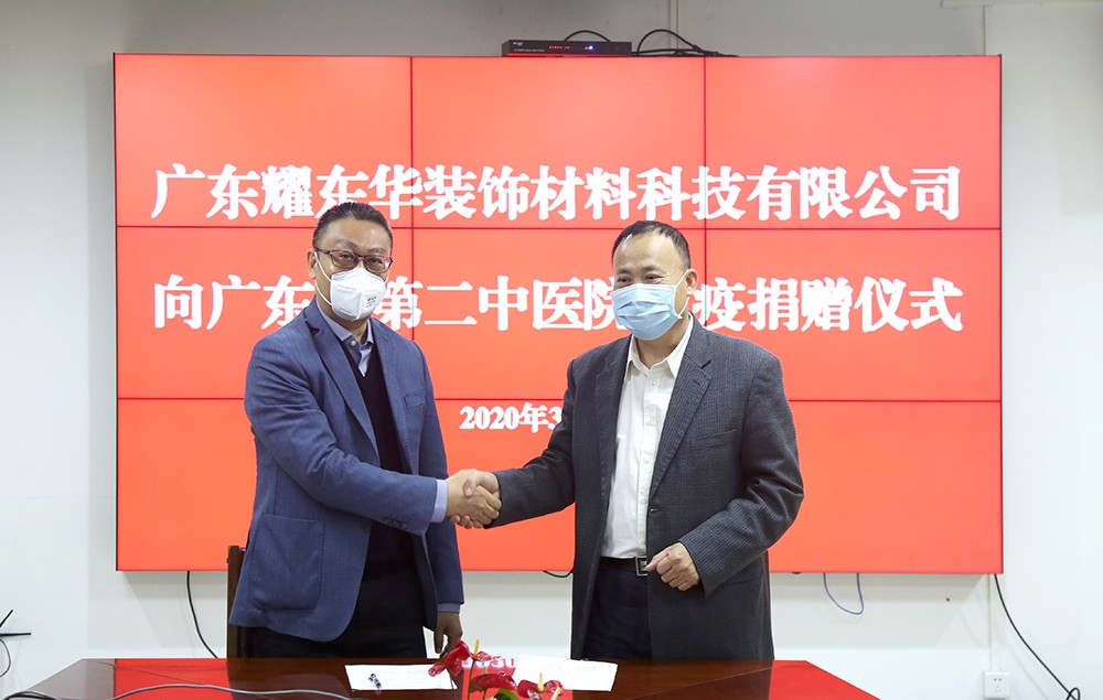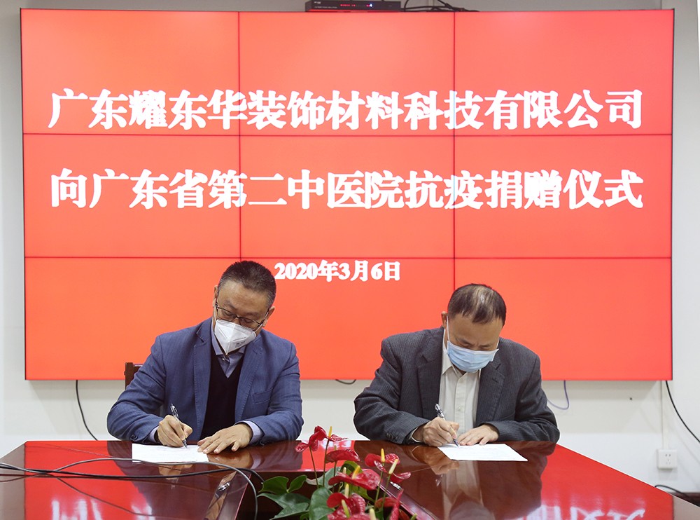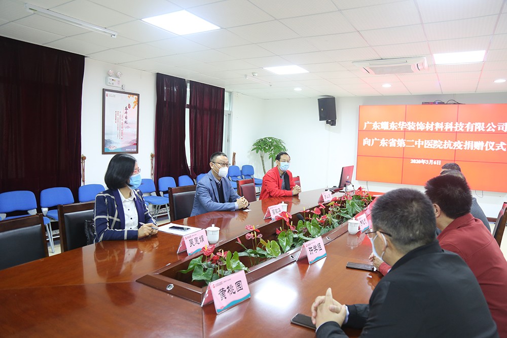 2020年3月6日下午,广东亿兆电竞首页|中国有限公司装饰材料科技有限公司向广东省第二中医院捐赠一批“红棉花”牌抗菌防霉饰面刨花板定制的家具,用于改善医院呼吸科医护人员及病人的环境,共同抗击新肺疫情,捐赠仪式在广东省第二中医院举行。