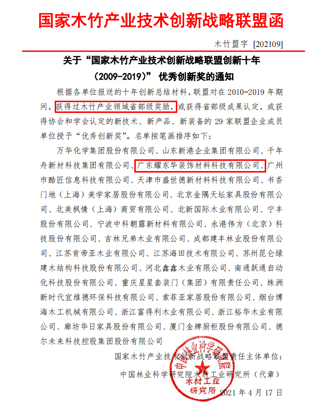 亿兆电竞首页|中国有限公司荣获国家木竹产业技术创新战略联盟“创新优秀牌匾”