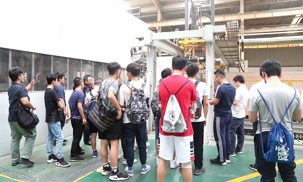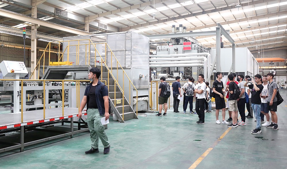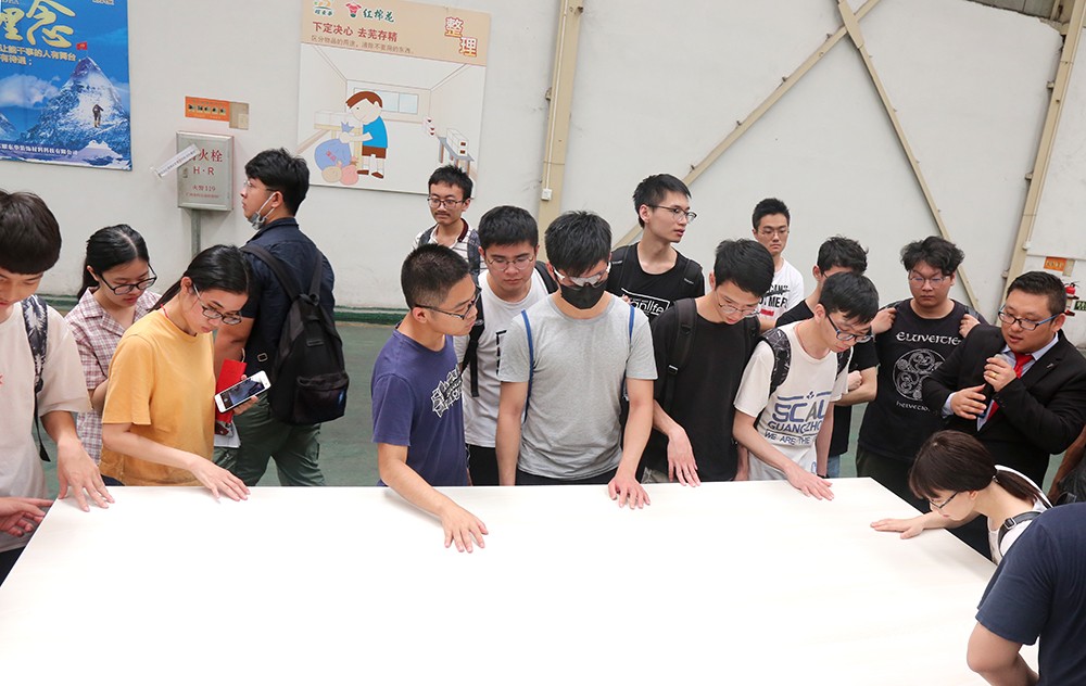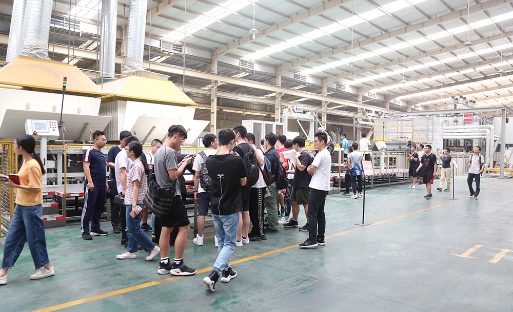 在我司领导及研发部相关负责人的陪同下,学子们参观了德国温康纳双面同步对纹饰面人造板自动压贴生产线,大家就饰面板的生产流程及工艺等展开了交流。