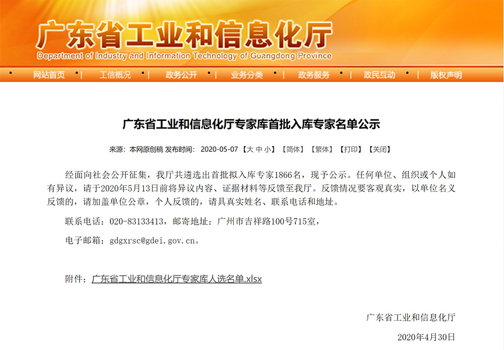 2020-05-30亿兆电竞首页|中国有限公司公司曾敏华董事长首批入库“广东省工业和信息化厅专家库”