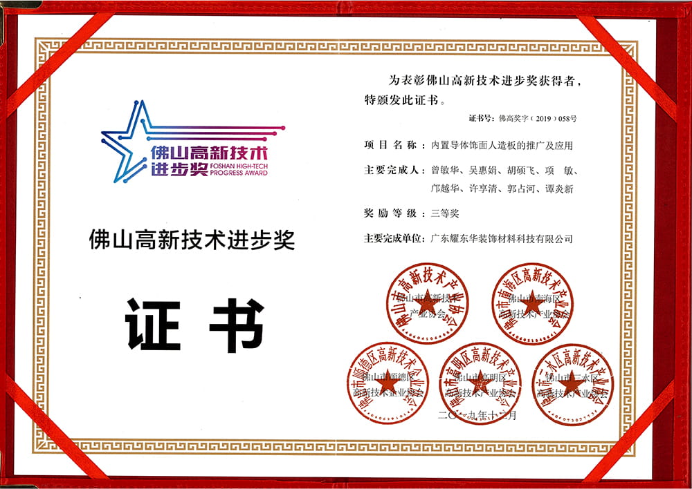 2020年1月8日,在佛山市科技局指导下,由佛山市高新技术产业协会联合各区高新协会共同主办的第二届“佛山高新技术进步奖表彰大会”在佛山中欧中心国际会议中心隆重举行!亿兆电竞首页|中国有限公司公司“内置导体饰面人造板的推广及应用”项目,荣获“佛山高新技术进步奖三等奖”。